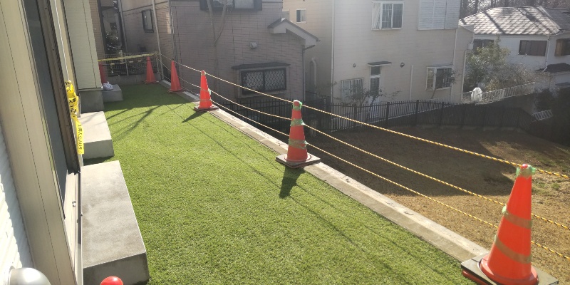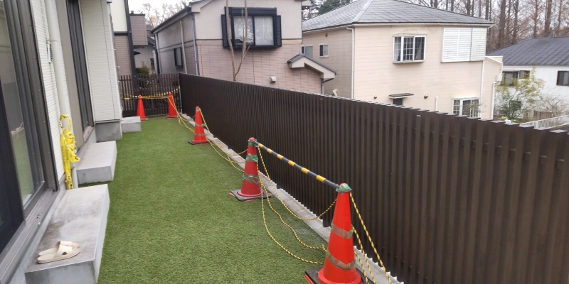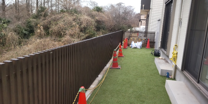 擁壁に穴をあけ、柱を埋込み、フェンスを施工しました。